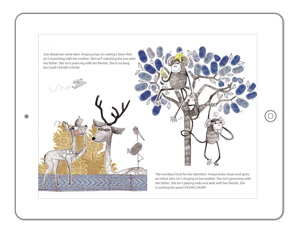 A common plight faced by every parent was taken up as the theme for the story. Little Anaya loves sucking her thumb, but finally realizes itโs not fun! This got me thinking whether the crux of the story could be captured through visuals that worked as a cue. How do I tell a little child that thumbs and fingers can be used for so many playful activities? While working on the visuals I began to use my thumbs to make textures, backgrounds, animals and figures. The story had a happy, but nuanced style with a motley of thumb prints across the pages.